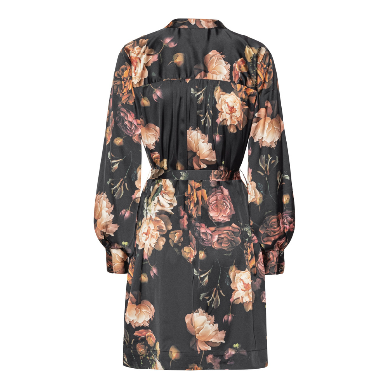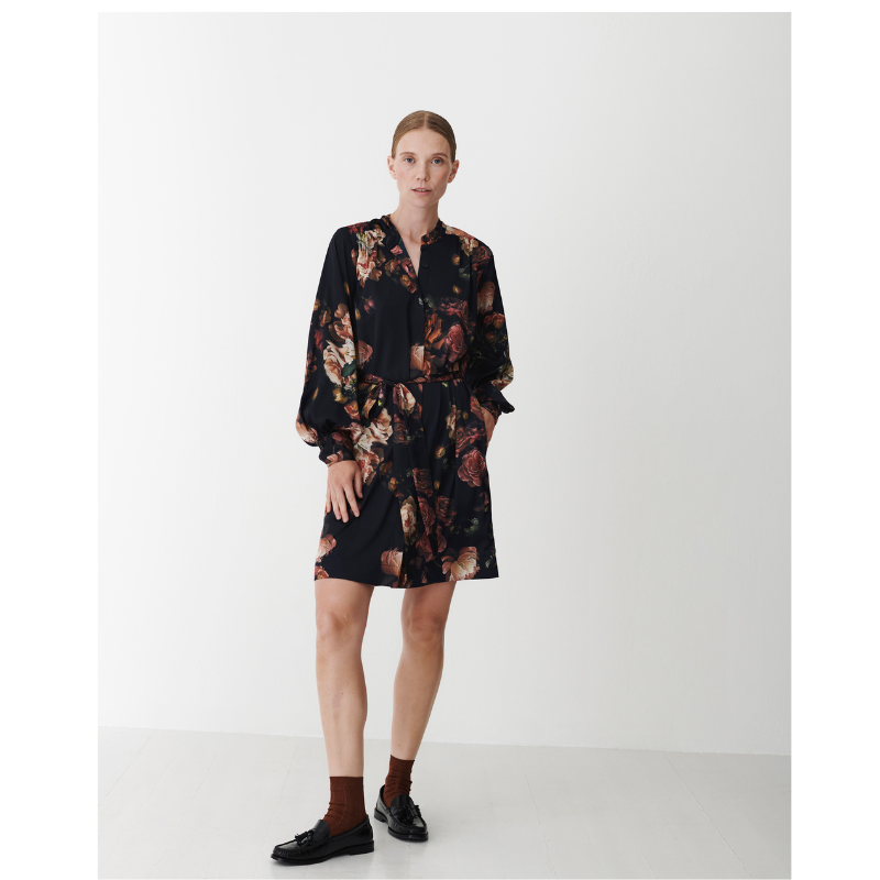 Agnes Dress fra Karmamia Copenhagen. Mellemlang skjortekjole med Kina-krave i et smukt print. Kjolen kan bæres med eller uden bælte.