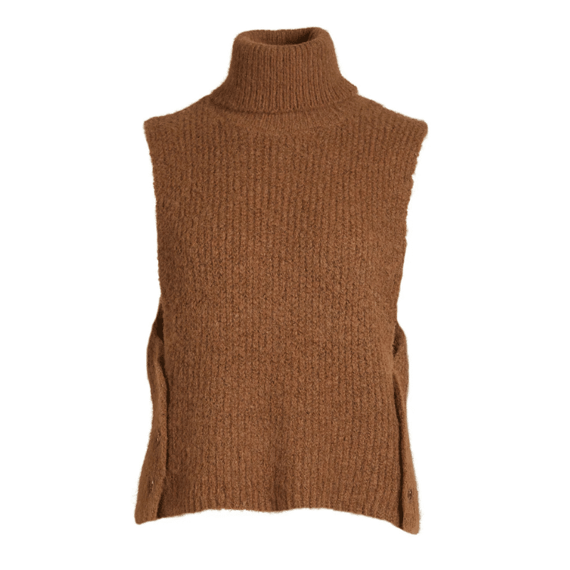 Agnes vest fra NÜ. Denne strikvest har en høj krave og en grovstrikket overflade, der giver et varmt og struktureret udtryk. Vesten er ærmeløs og har knapdetaljer i begge sider, som både giver et dekorativt element og gør den nem at tage af og på. Den har en afslappet pasform, som gør den ideel til lag-på-lag looks.