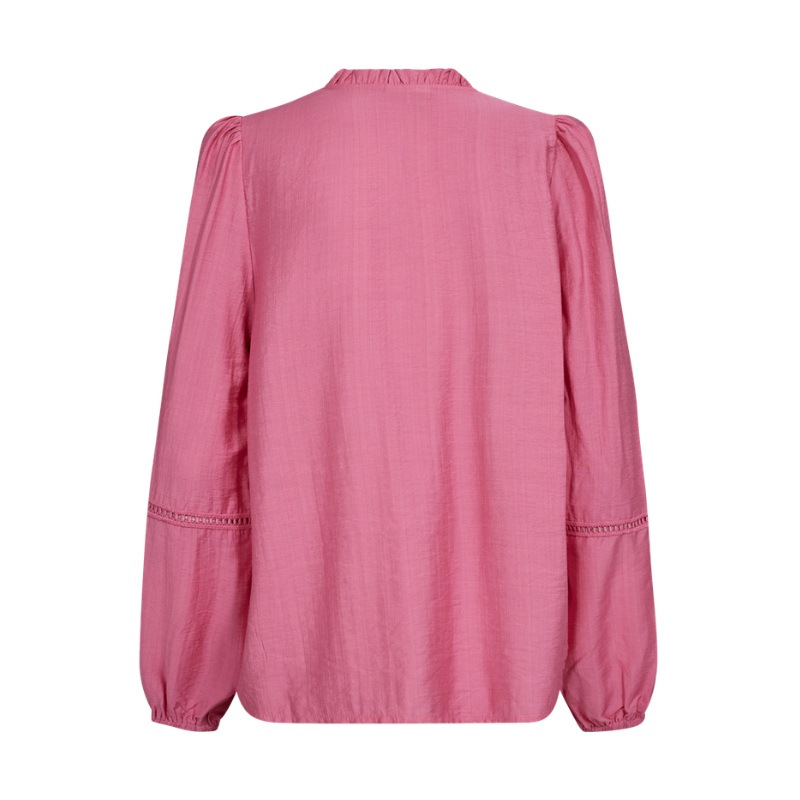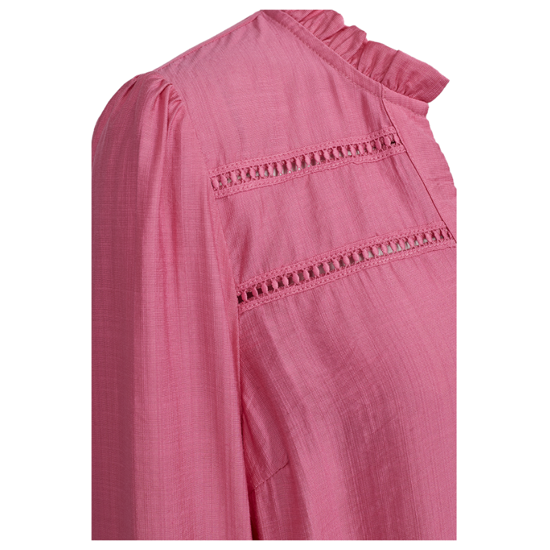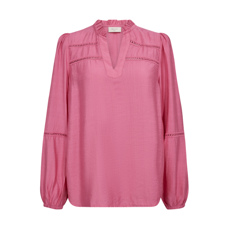 Anita bluse fra Freequent i en blød kvalitet. Blusen har lange ballonærmer med elastik cuff, V-udskæring med flæsekant, en løs pasform samt lace insert, der giver et fint sneek peak ind til huden. Fås i flere farver.
