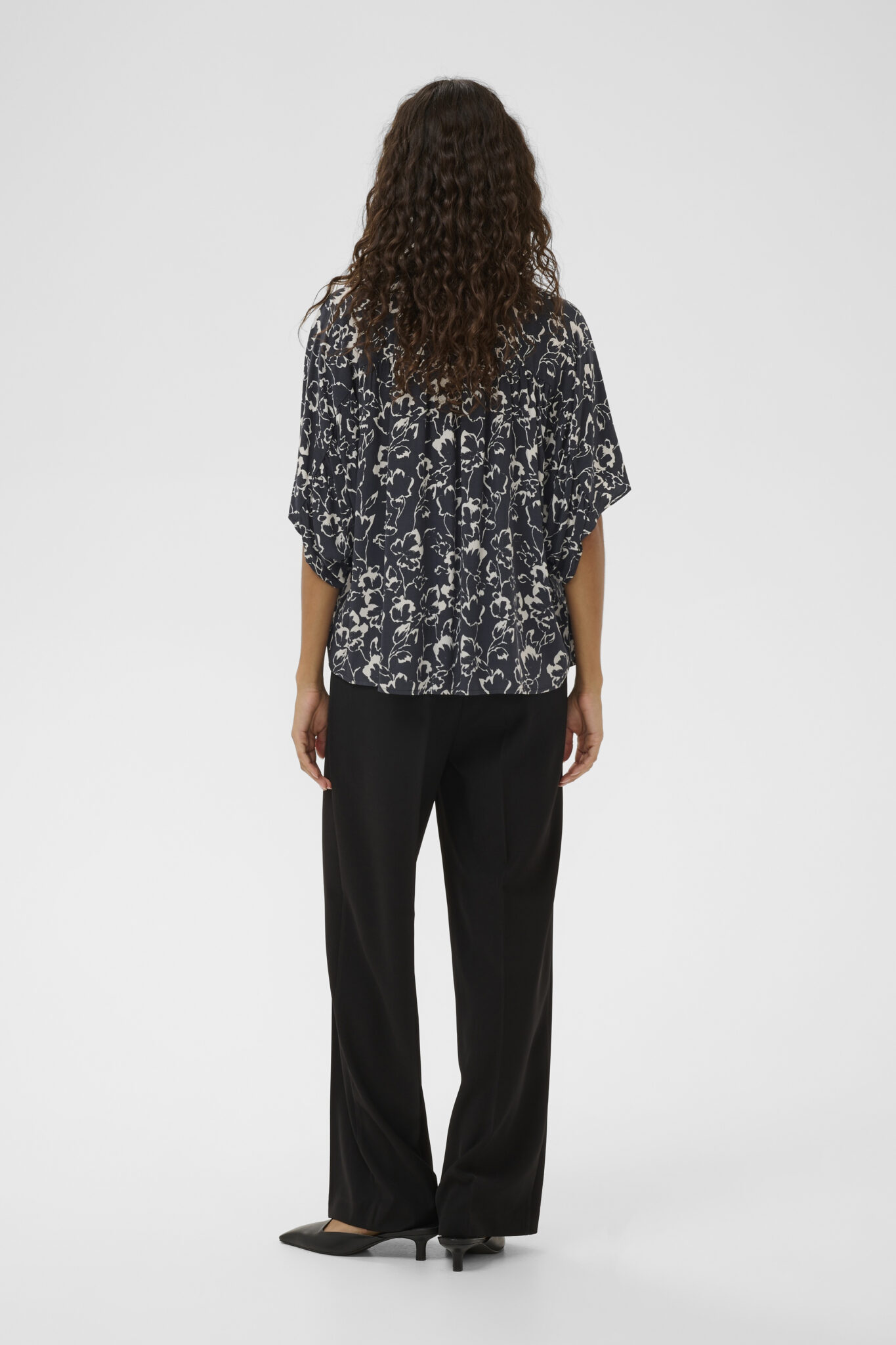Blusen har en simpel rund hals og knapper foran. Derudover har blusen lette fald ved ærmerne, som giver et feminint og elegant udtryk.