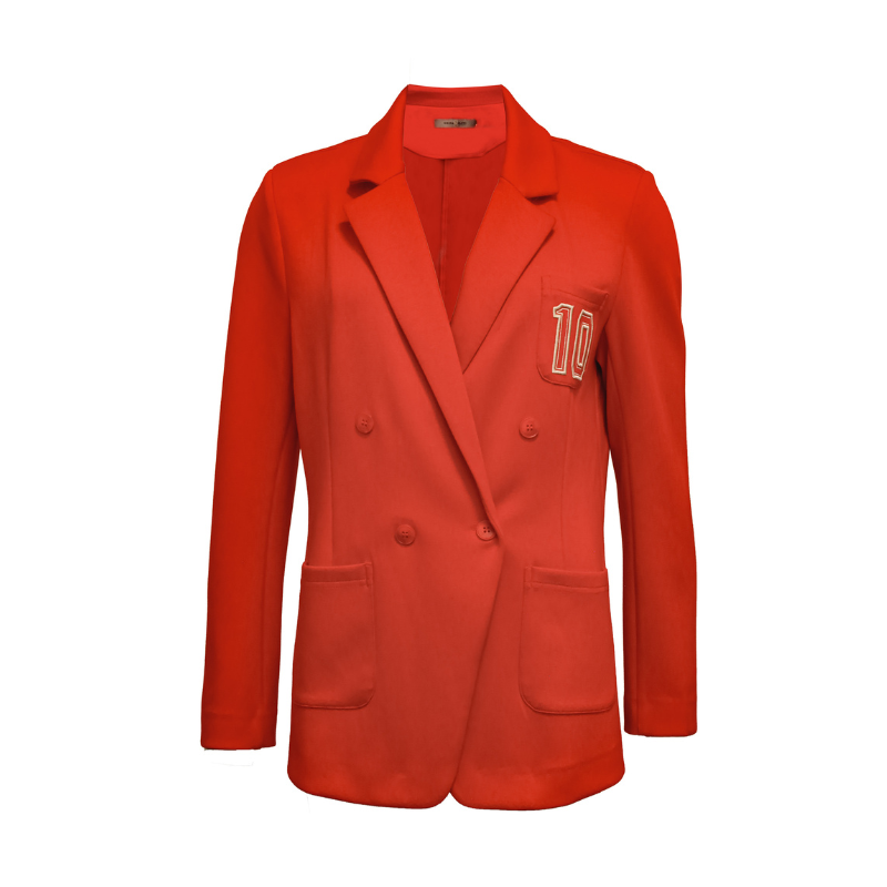Birdie Blazer fra Costa Mani er en unik blazer med et farvedesign i rød. Jakken har klassisk revers og dekorativt broderet “10” på brystet. Kombinationen af det sporty udtryk og den elegante blazerform giver et friskt og trendy look. Perfekt til at pifte hverdagsoutfits op.