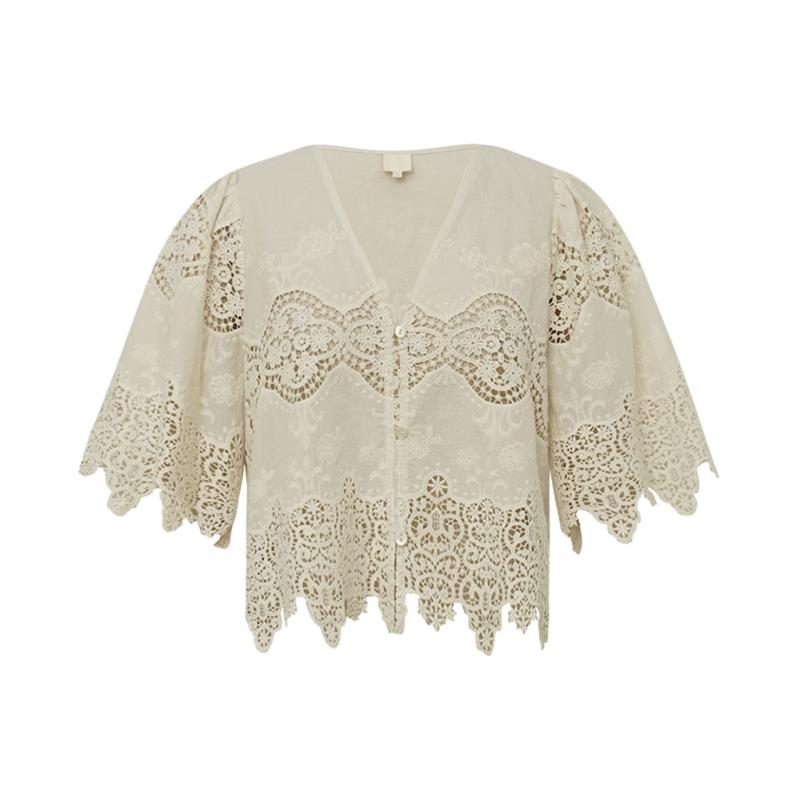 Blusen har knaplukning foran og lette puffærmer, som tilføjer et feminint og stilfuldt touch. Den smukke blonde fremhæver det gennemførte design og giver en luksuriøs finish – perfekt til dig, der søger en festbluse dame eller en bluse med blonder, der skiller sig ud.