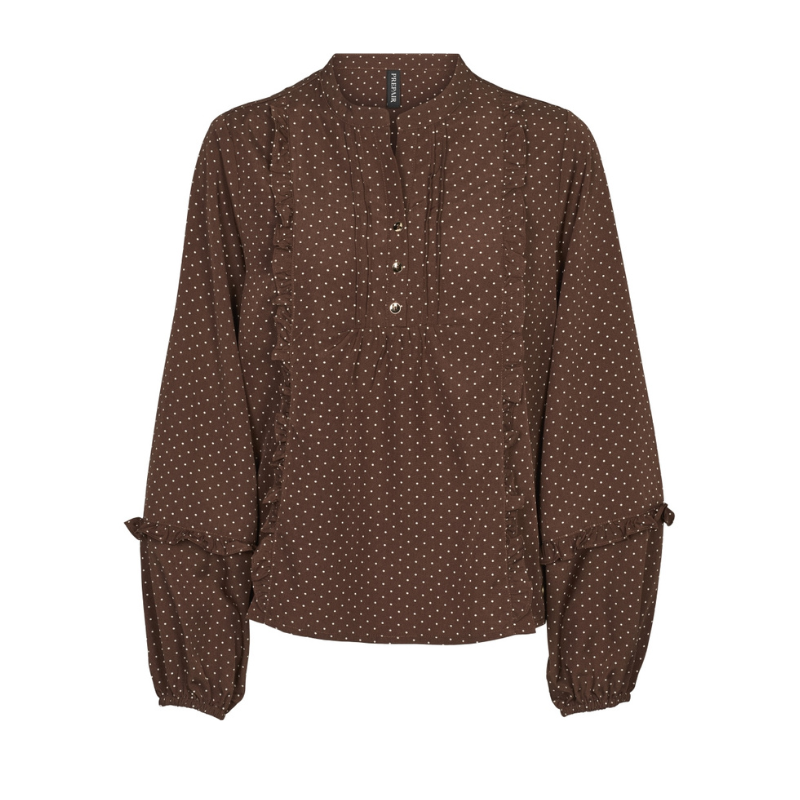Camilla blusen fra Prepair er en feminin og let bluse med et elegant prikket mønster. Blusen har en rund hals med lille V-åbning og knappelukning foran. Fine flæsedetaljer løber lodret langs fronten og på ærmerne og tilfører en romantisk kant til designet. Ærmerne er lange med let vidde og afsluttes med elastik ved håndleddene, hvilket giver en behagelig pasform og et let puffet look.