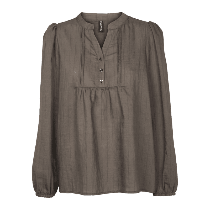 Camilla blusen fra Prepair har v-hals med 3 knapper ned foran og fine feminine læg ved brystet, lange ærmer med elastik ved håndleddet og et let puffede skuldre med fine rynkedetaljerer.