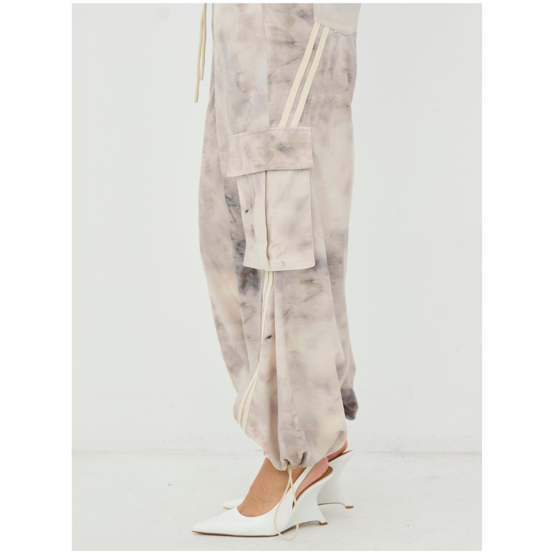 Claire bukser fra NÜ. Disse bukser har en afslappet pasform med volumen i benene og elastik samt snøre i taljen, som gør dem nemme at justere. De store cargolommer på siderne tilfører et cool udtryk, mens snøredetaljen ved anklerne giver mulighed for at tilpasse faconen. Fronten er enkel, og bagsiden følger samme rolige linje. Style bukserne med en enkel top eller skjorte og eventuelt den matchende overdel for et afslappet, men gennemført hverdagslook.