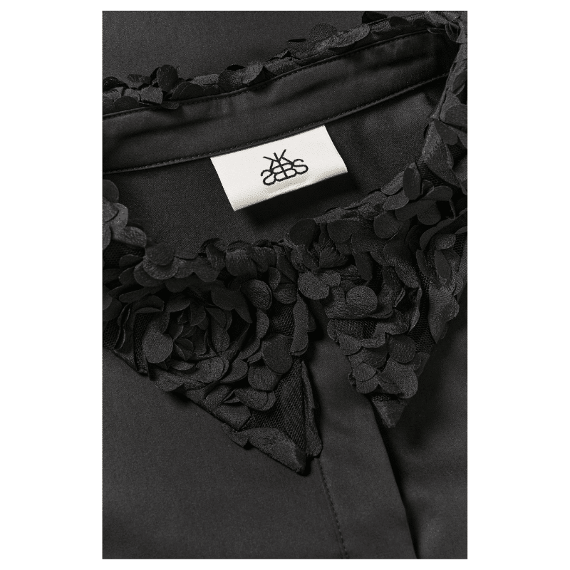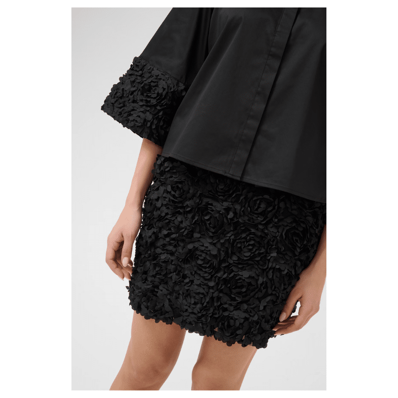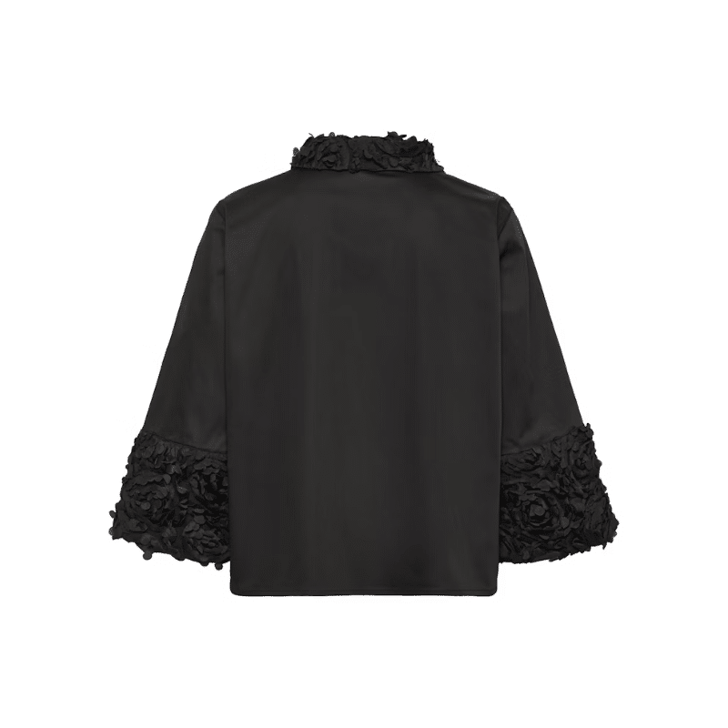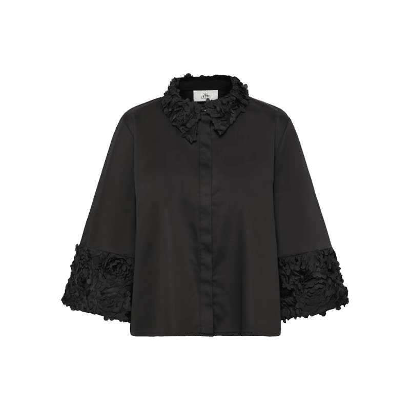 Kortærmet skjorte med boxy pasform og en markant tekstur, prydet med tonale 3D blomsterdetaljer på kraven og ærmekanterne. Skjult lukning foran og let cropped længde.