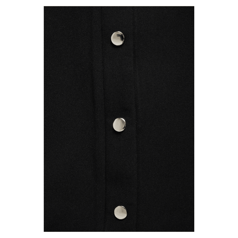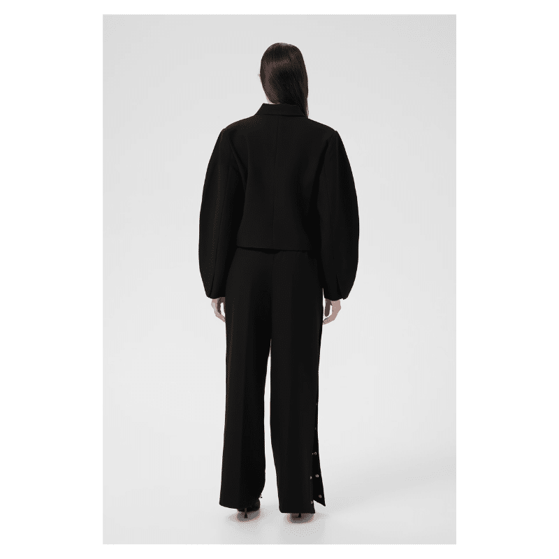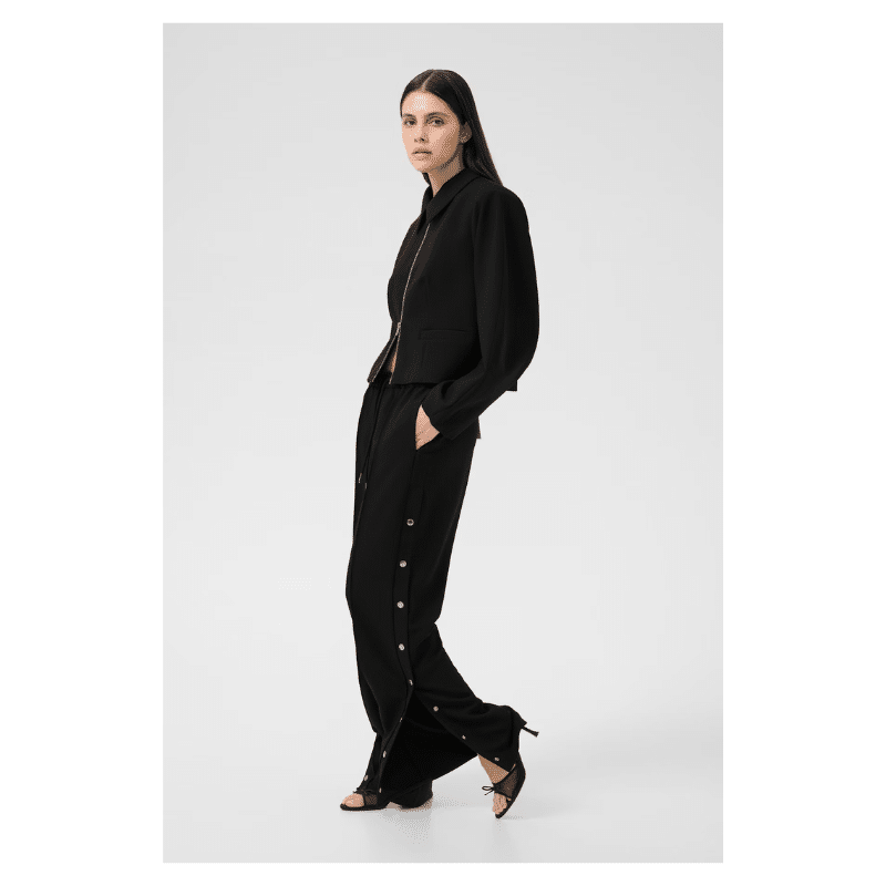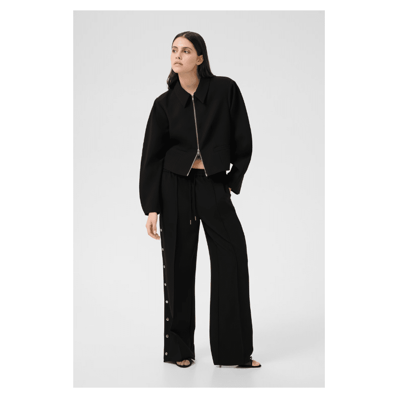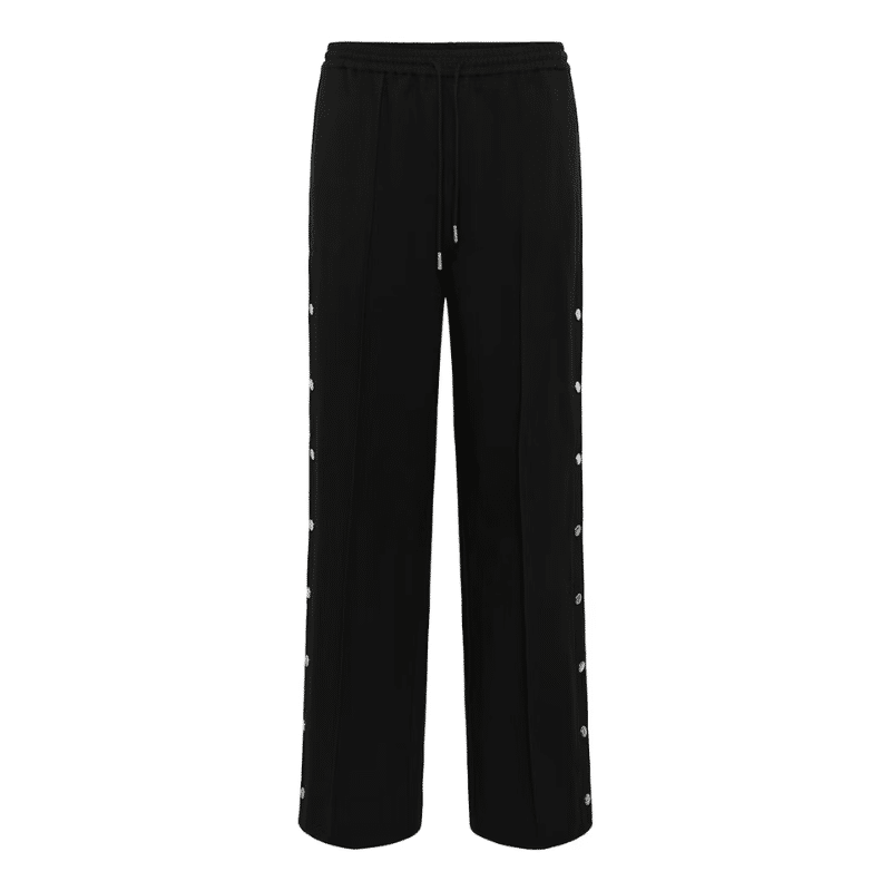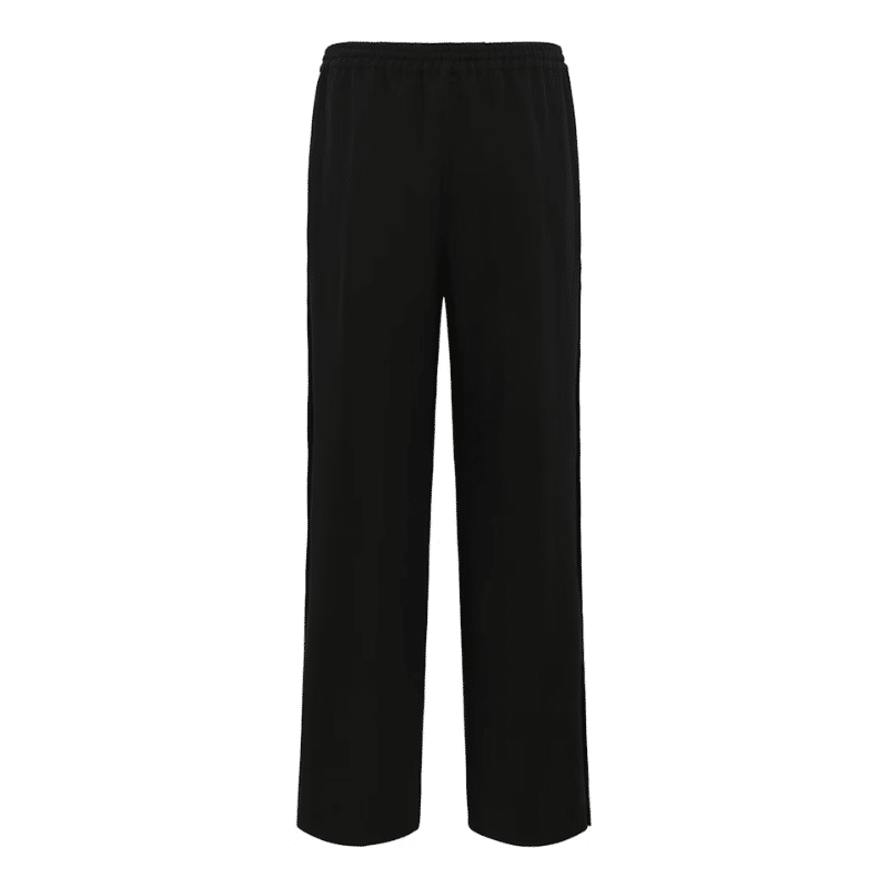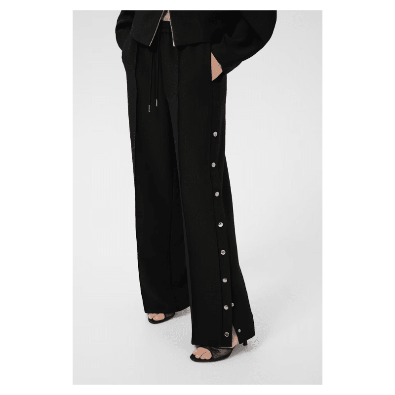 Bukser med straight fit og brede ben, elastisk talje med snøre og gennemgående trykknapper langs siderne. Enkel, moderne silhuet med glat overflade.