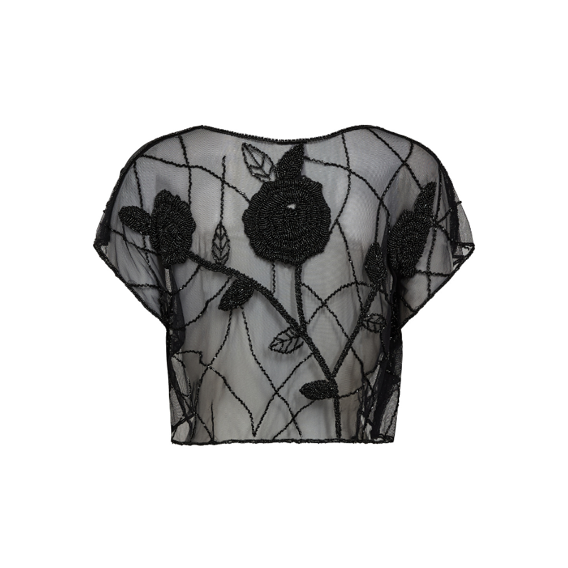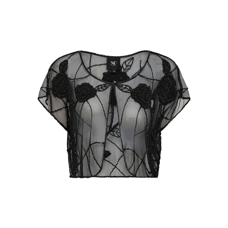 Dee Bolero fra NÜ er fremstillet i let mesh med fine broderede detaljer, som skaber et elegant og dekorativt udtryk. De florale mønstre tilfører struktur og giver et eksklusivt præg, mens den korte, åbne pasform gør den ideel som et let lag. Den transparente kvalitet giver et luftigt look, der falder blødt over kroppen og tilfører dybde til dit outfit.