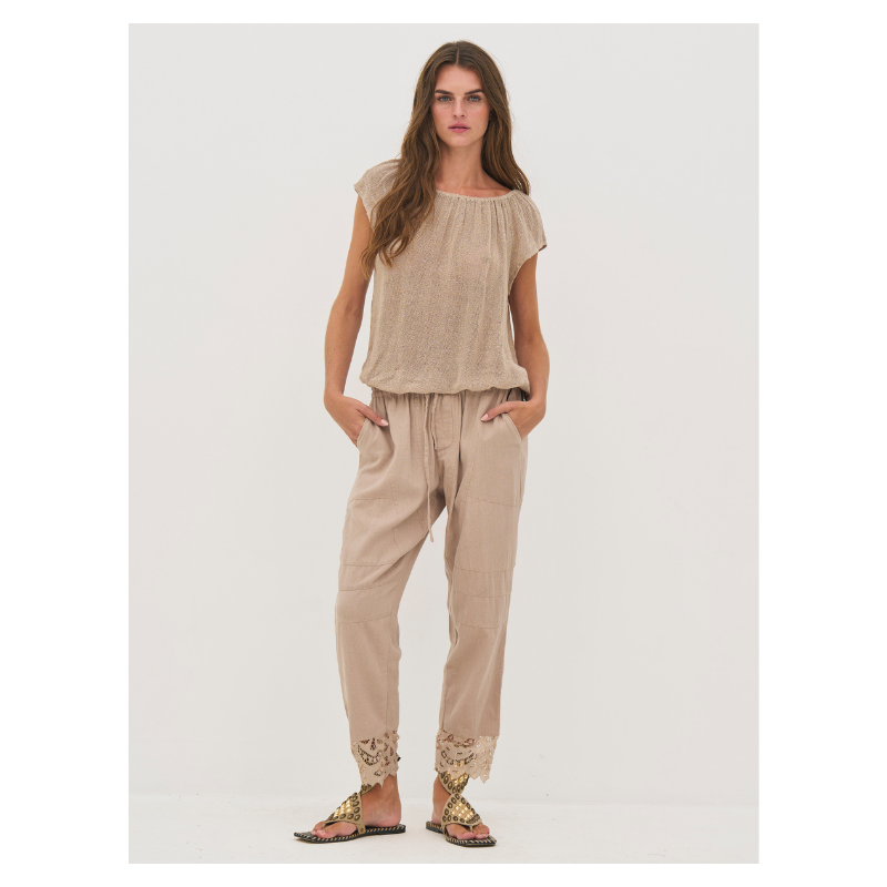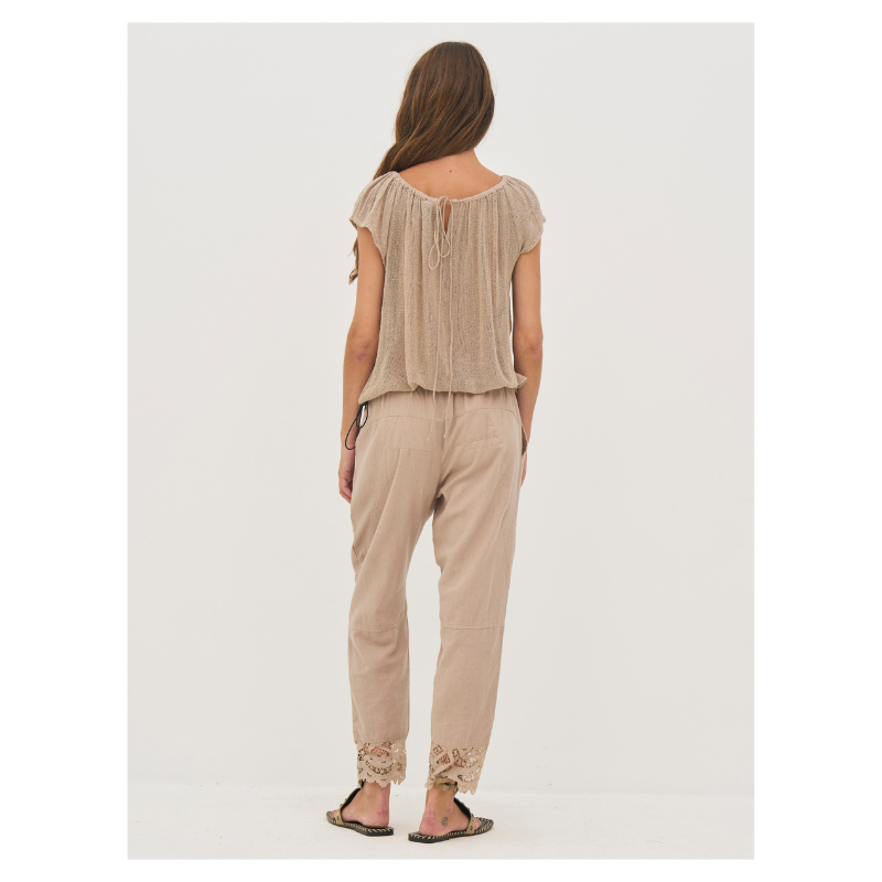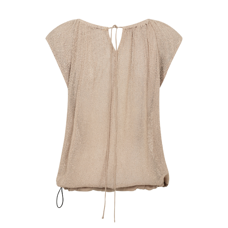 Dewi Top fra NÜ er fremstillet i en let viskose- og bomuldsblanding med en fin boucléstruktur, som giver et levende og naturligt udtryk. Den har en løs pasform med korte ærmer og en blød halsudskæring med bindedetalje, der kan styles både oppe eller let ned over skuldrene. Den justerbare snøre i bunden gør det muligt at tilpasse pasformen og skabe variation i silhuetten.