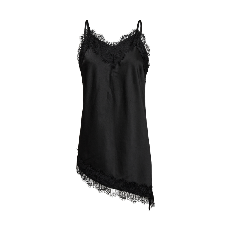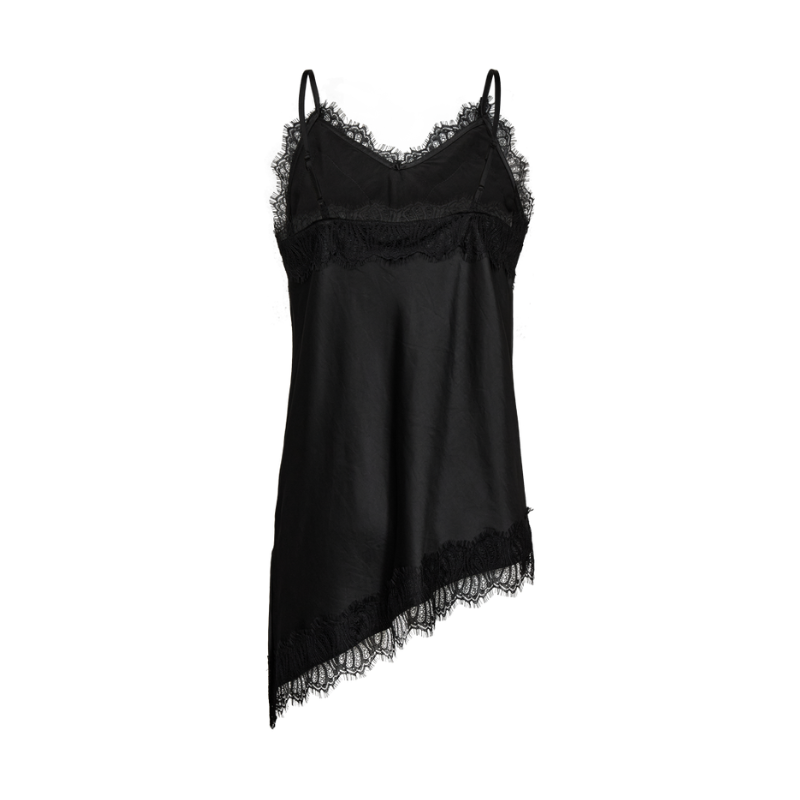 Dova top fra Freequent. Smuk og feminin top i satinfinish med blondekant og en asymmetrisk bund.