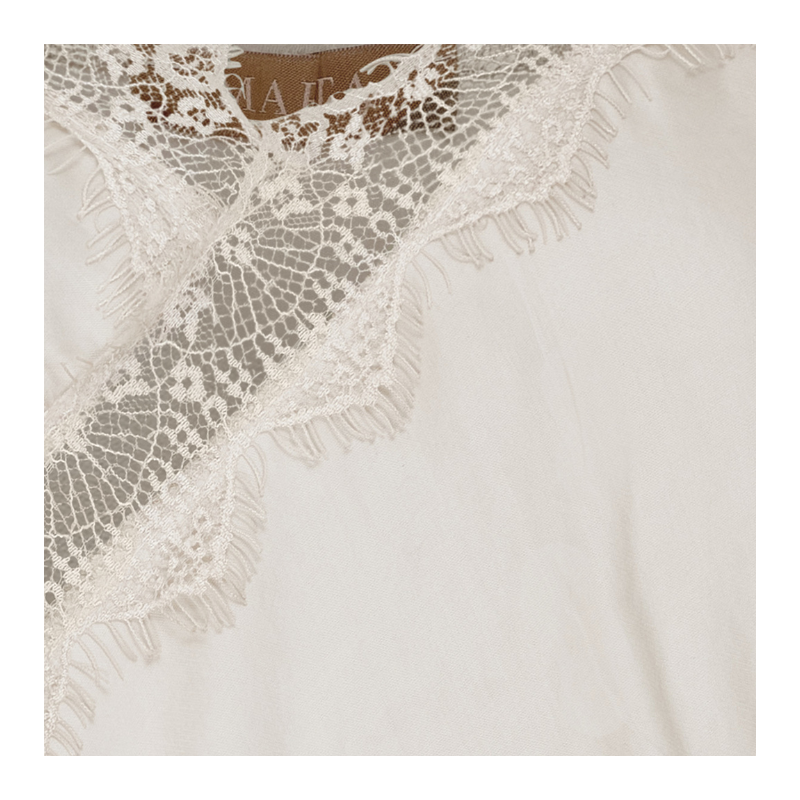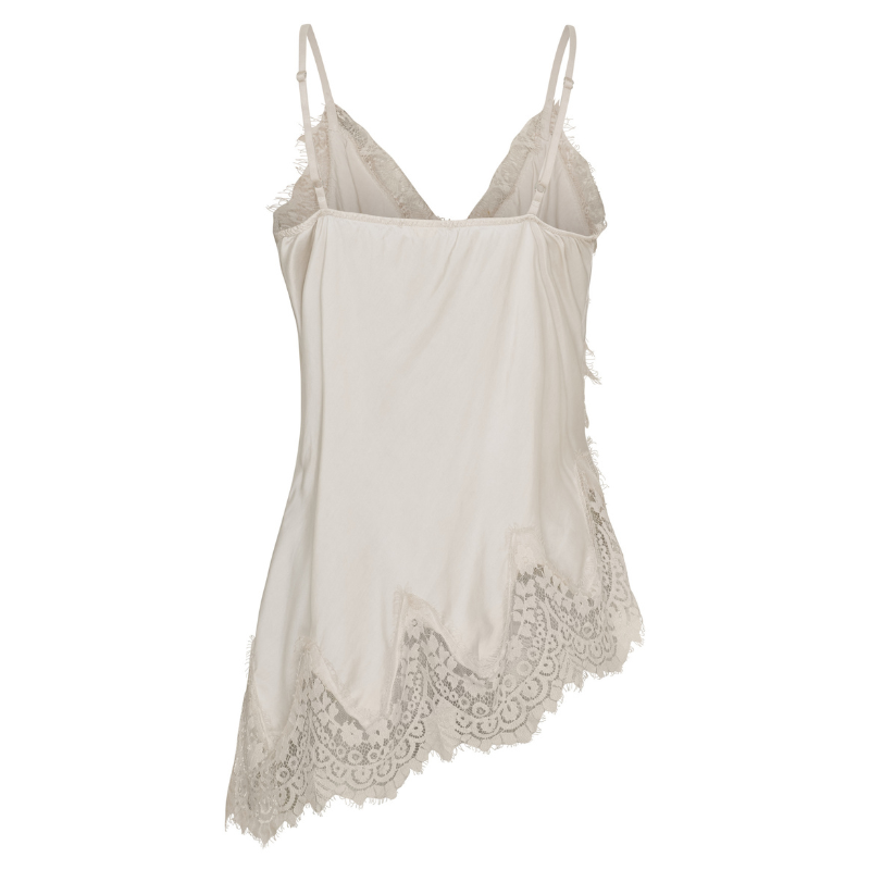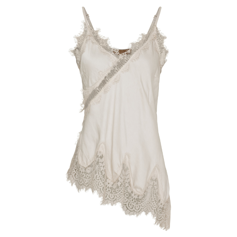 Elegant og smuk top med blondekant og asymmetrisk bund i en lækker viskose kvalitet. Fås også i sort og brun.