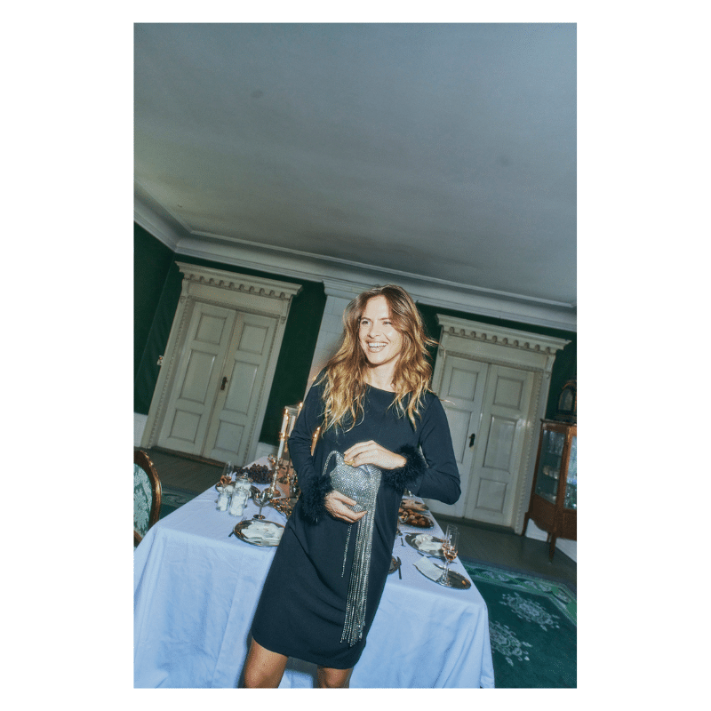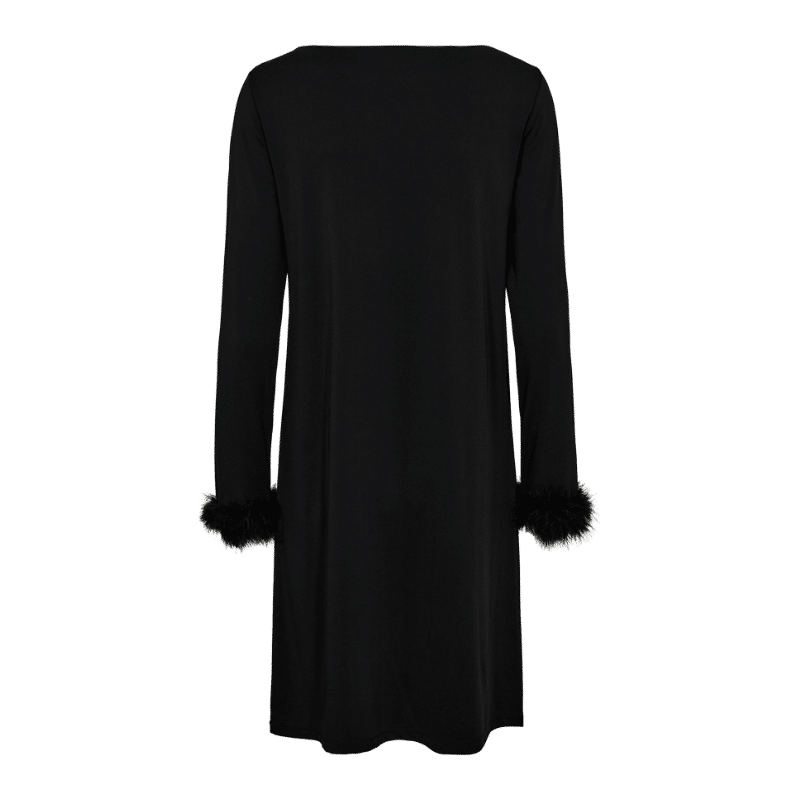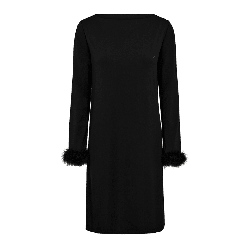 Elva kjole fra Freequent i en blød kvalitet. Kjolen er enkel i modellen med en elegant bådudskæring, A-facon samt lange ærmer med de fineste fjermanchetter. En detalje, der giver en rigtig flot effekt.