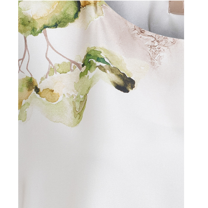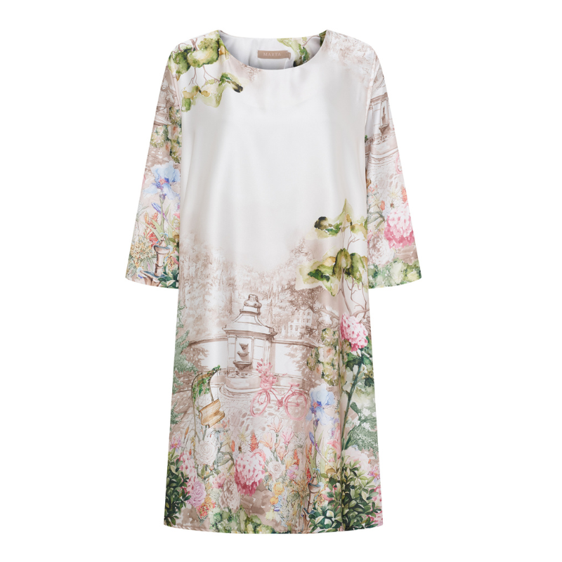 Fabiana kjole fra Marta er en smuk og feminin kjole med et kunstnerisk print i bløde, harmoniske farver. Kjolen har et let og luftigt udtryk, hvor det enkle snit kombineres med dekorative printdetaljer på ærmer og nederdel. Den løse pasform og den behagelige kvalitet gør kjolen ideel til både hverdagsbrug og mere afslappede sommeranledninger. De 3/4 lange ærmer giver et elegant touch og gør den nem at style sæson efter sæson.