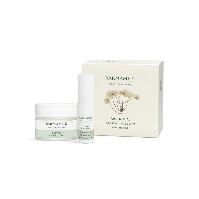 En lækker gaveæske der indeholder Karmameju’s COTTON ansigtscreme og COUTURE øjencreme.