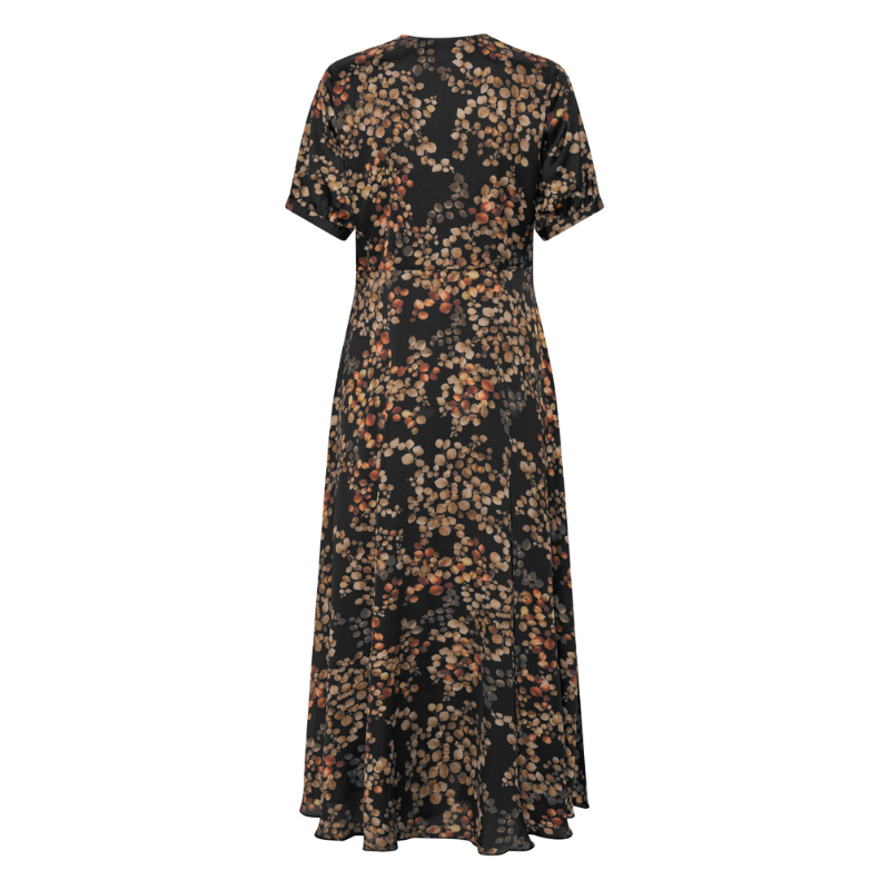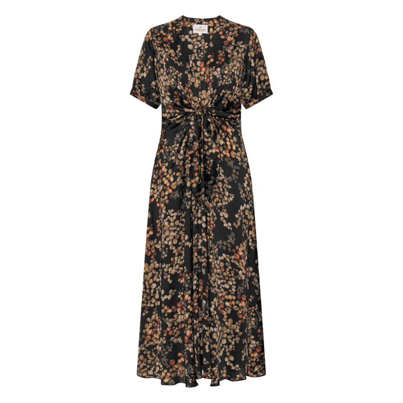 Faye Kjole fra Karmamia er en formel maxikjole med V-udskæring og bindebånd i taljen. Den smukke kjole har korte ærmer.