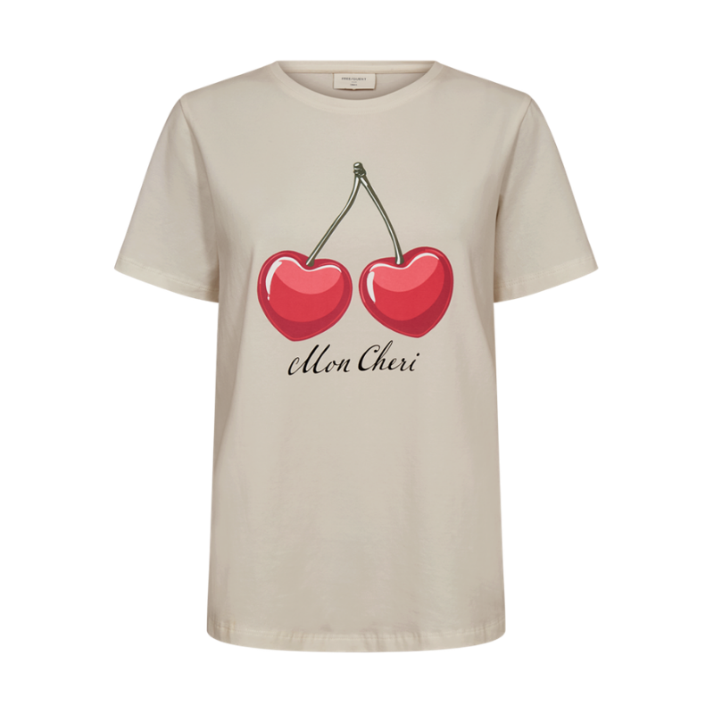 Fenjal t-shirt fra Freequent i en blød kvalitet. T-shirten er enkel i modellen med en løs pasform, korte ærmer, en rund halsudskæring med ribkant samt print på fronten. Fås også i hvid.