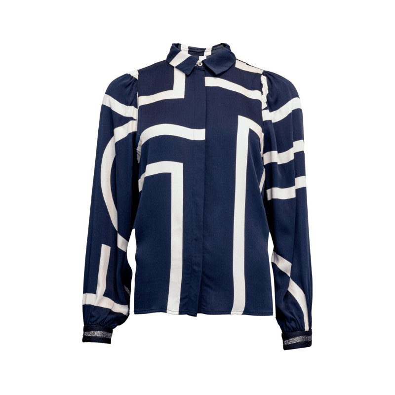 Fey skjorte fra Costa Mani. Elegant skjorte med et moderne grafisk print i blå og hvide kontraster. Den er lavet i 100% viskose, som giver et let og behageligt fald. Skjorten har en klassisk pasform og kan styles både til hverdag og festlige lejligheder.