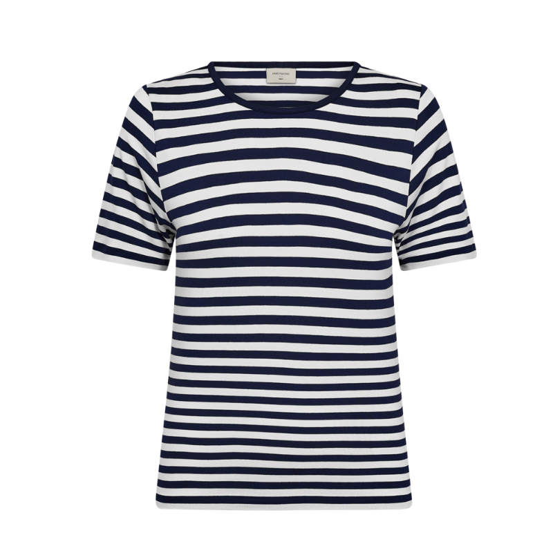 Liana kortærmet t-shirt fra Freequent i en blød kvalitet med kontraststriber. Derudover er t-shirten enkel i modellen med rib i den runde halsudskæring samt en smal pasform.