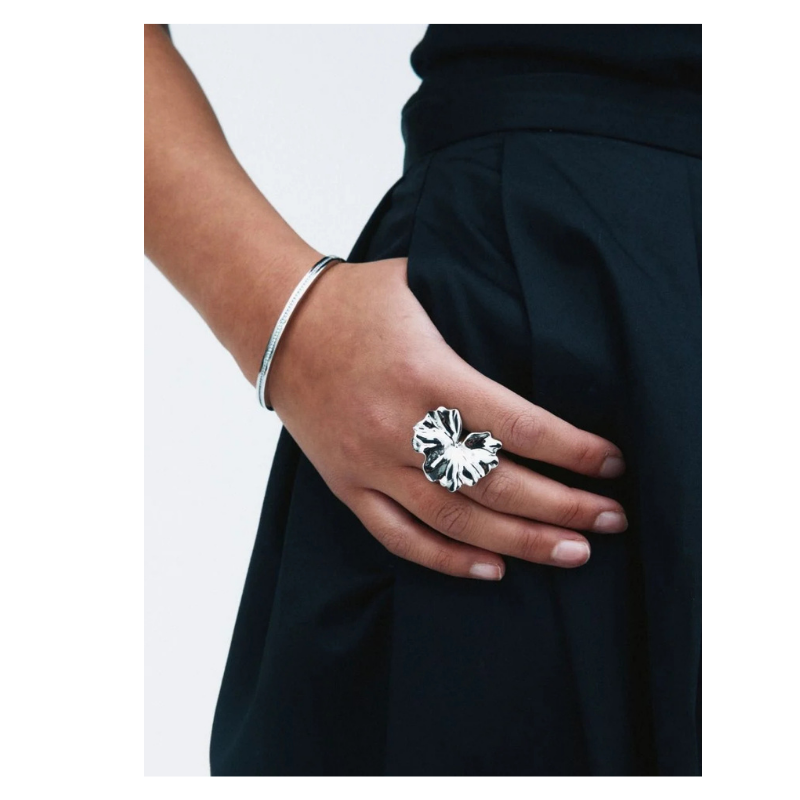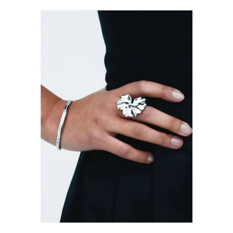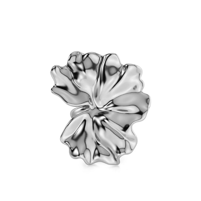 Store, bølgende blomsterblade spiller hovedrollen i Gerana. På seriens flotte ring, her i blankt rustfrit stål, folder den stilfulde blomsterbladsform sig smukt ud over hånden. Moderne, stilren og pæn. Kombinér gerne med flere dele fra serien.