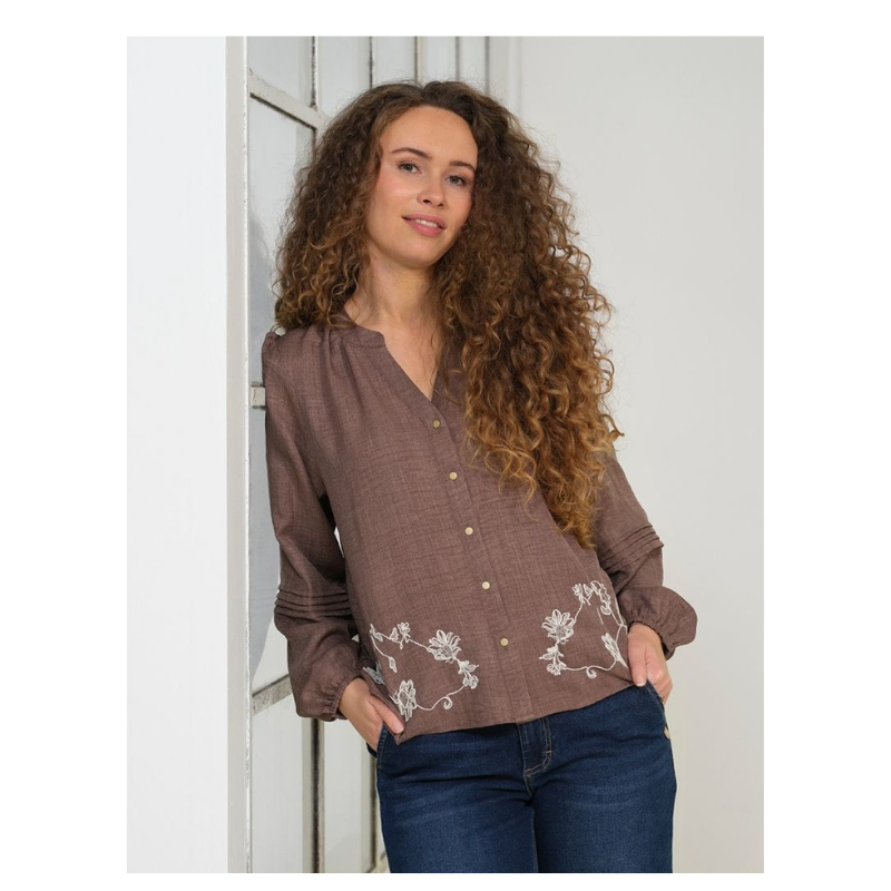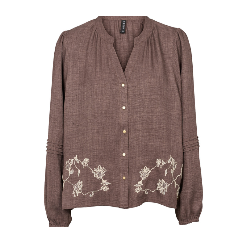 Harriet blusen fra Prepair er en elegant og feminin bluse med smukke broderede blomsterdetaljer langs kanten. Blusen har en lille V-udskæring og gennemgående knapper foran. De fine læg ved skuldrene og de dekorative læg på ærmerne giver et let og smukt udtryk. Ærmerne afsluttes med elastik for et blødt, puffet look.