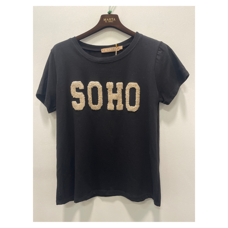 Herdis Tee fra Marta er en smart t-shirt i sort med beige “SOHO” tekst stående på brystet.