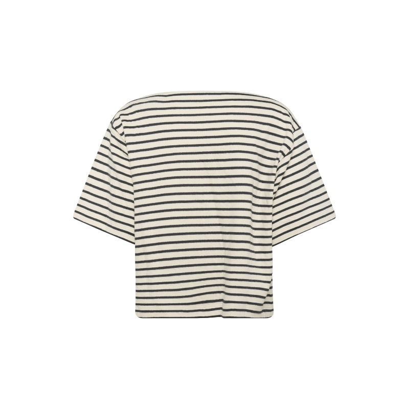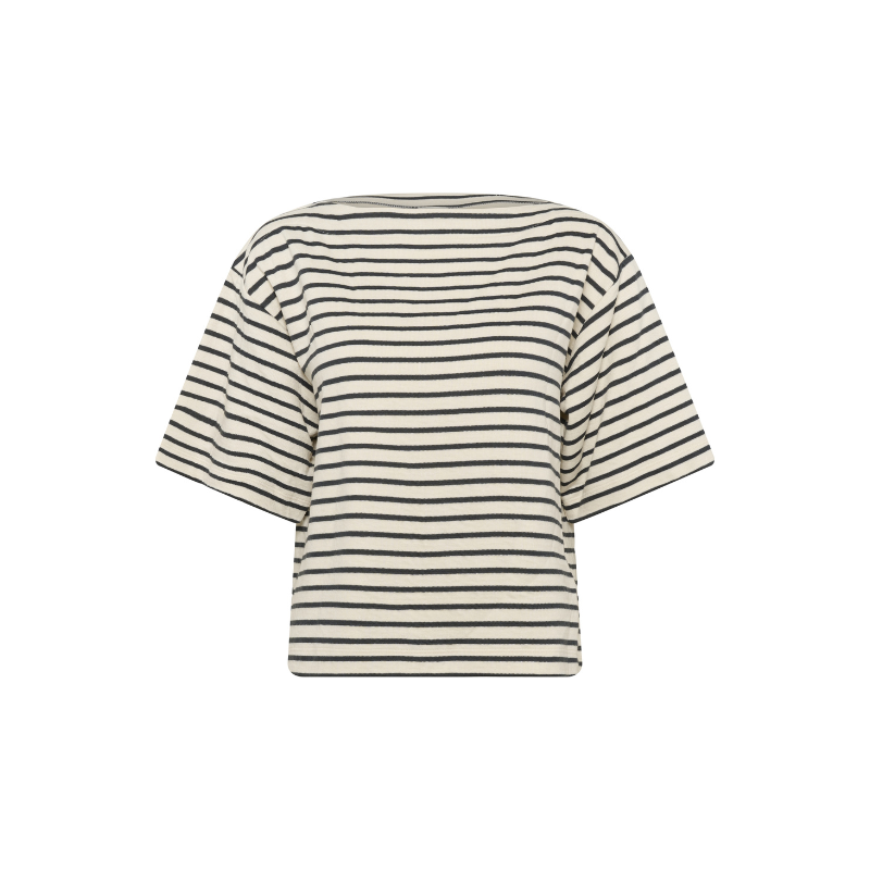 Ingina t-shirt fra Soaked. Stribet T-shirt med boxy, lige pasform og albuelange ærmer. Udtryk fuldendt med bred bådudskæring og blød, let tekstur for et cool look.
