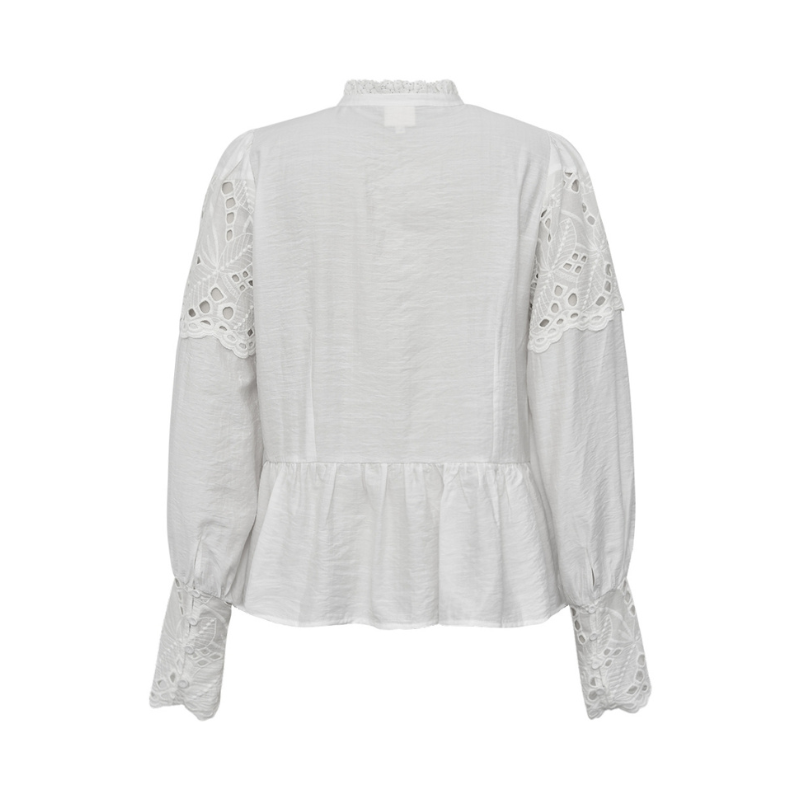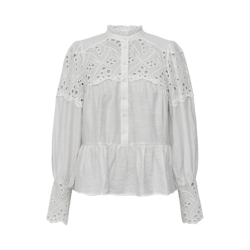 JolineGO bluse fra Gossia.  Denne bluse har et detaljeret design med broderede udskæringer på bryst og ærmer. Den har en høj hals med elastiske kanter. Ærmerne er lange og afsluttes med broderede detaljer. Blusen har rynkede detaljer forneden, som giver en let bølgende effekt.