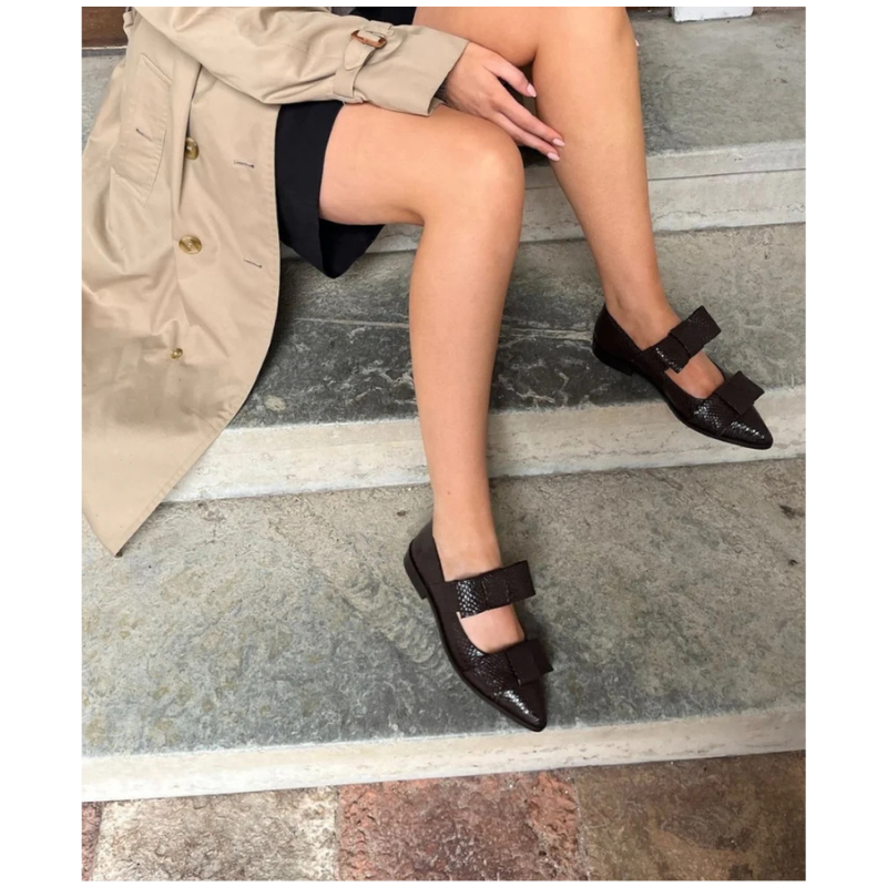 En sofistikeret ballerina med markant udtryk og eksklusiv slangestruktur i skind. De brede, strukturerede remdetaljer giver modellen et moderne twist, mens den spidse snude tilføjer et feminint og elegant look. En komfortabel og stilfuld sko, der løfter både hverdags- og arbejdstøj.