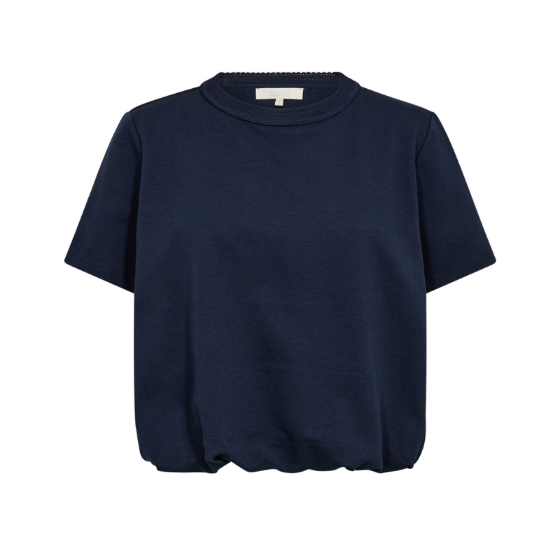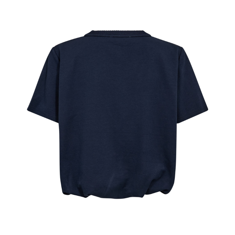 Denne feminine T-shirt til dame er designet med en smuk ballon-effekt i taljen, der skaber en flatterende silhuet og et eksklusivt udtryk. En elegant T-shirt, hvor enkle detaljer giver et stilrent look og en pasform, der både er afslappet og sofistikeret. Perfekt til dig, der søger en moderne T-shirt med kant.