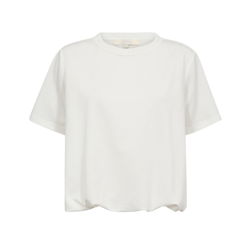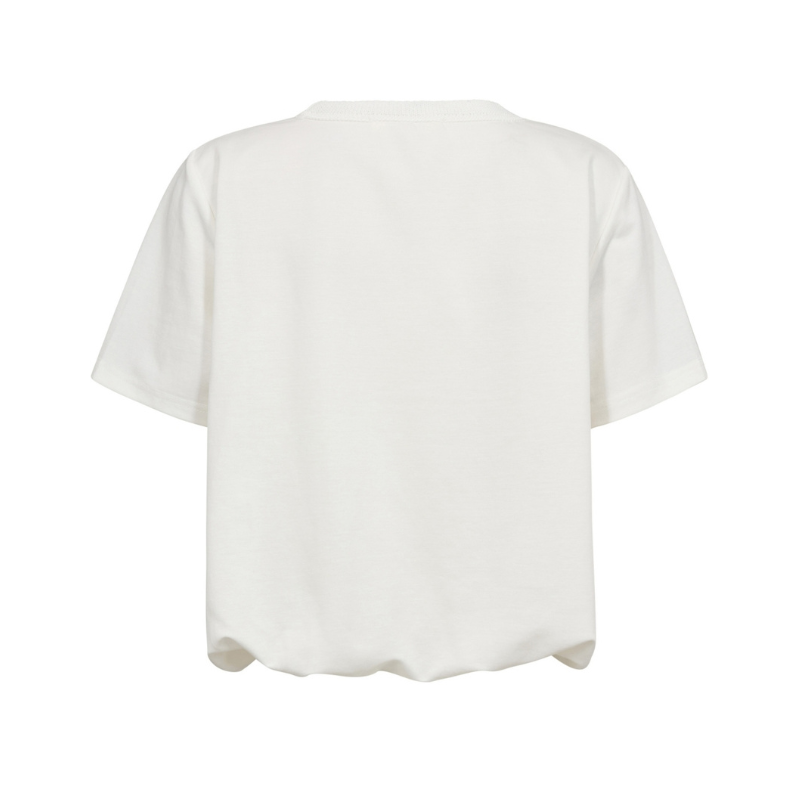 Denne feminine T-shirt til dame er designet med en smuk ballon-effekt i taljen, der skaber en flatterende silhuet og et eksklusivt udtryk. En elegant T-shirt, hvor enkle detaljer giver et stilrent look og en pasform, der både er afslappet og sofistikeret. Perfekt til dig, der søger en moderne T-shirt med kant.