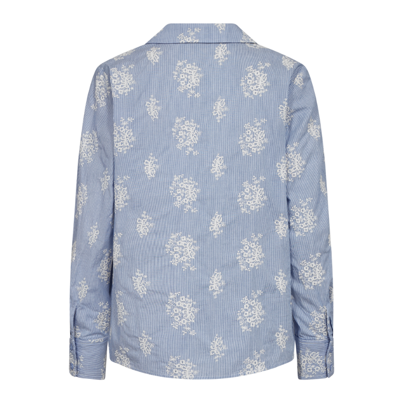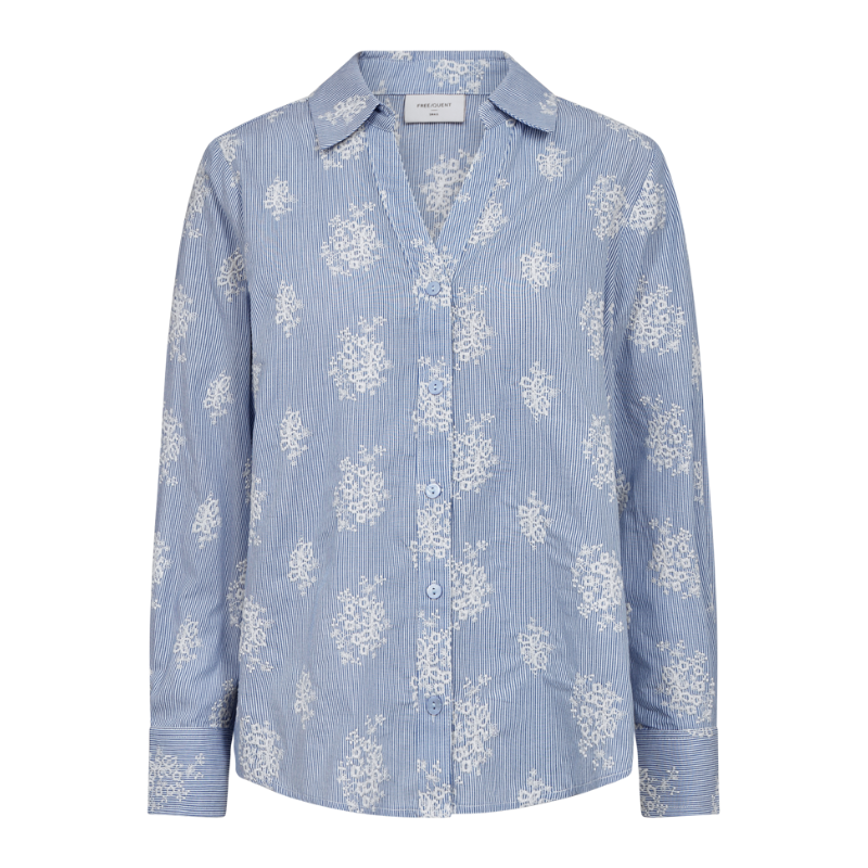Lela skjorte fra Freequent i en let kvalitet. En skøn stribet skjorte med fine broderet detaljer. Skjorten har klassisk krave, v-hals, lange ærmer og så er den gennemknappet foran.