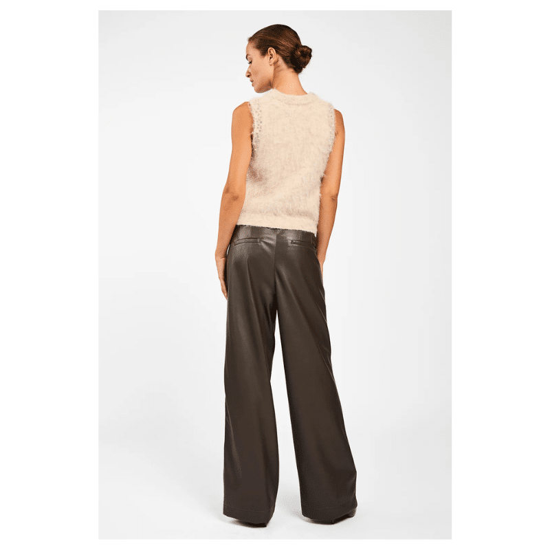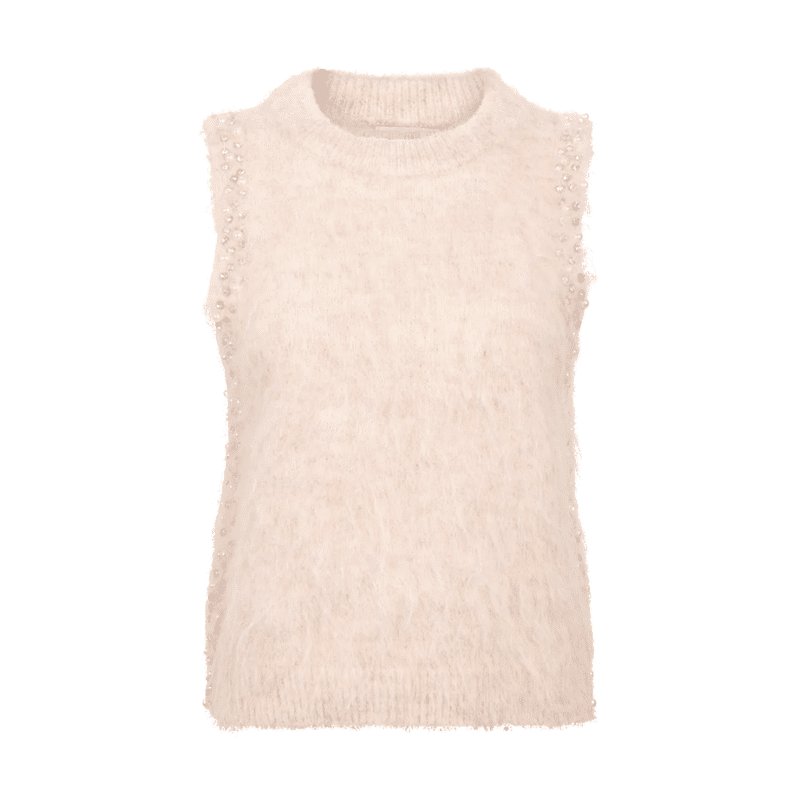 Lena vest fra Aaiko er en ærmeløs strik med rundhals i cremefarve med en blød og fluffy tekstur. Vesten har fine rhinestones og perler langs siden som giver en feminin detalje. Vesten er perfekt til lag-på-lag eller som et statement-stykke med højtaljede bukser.