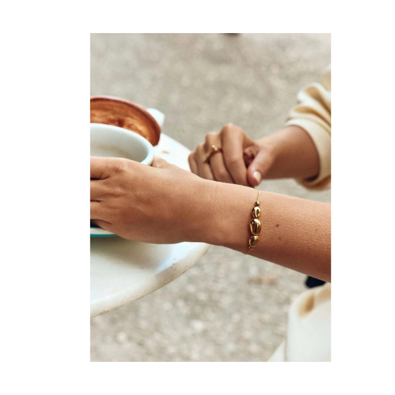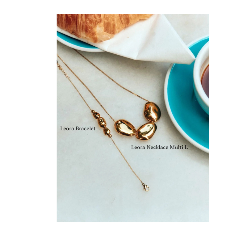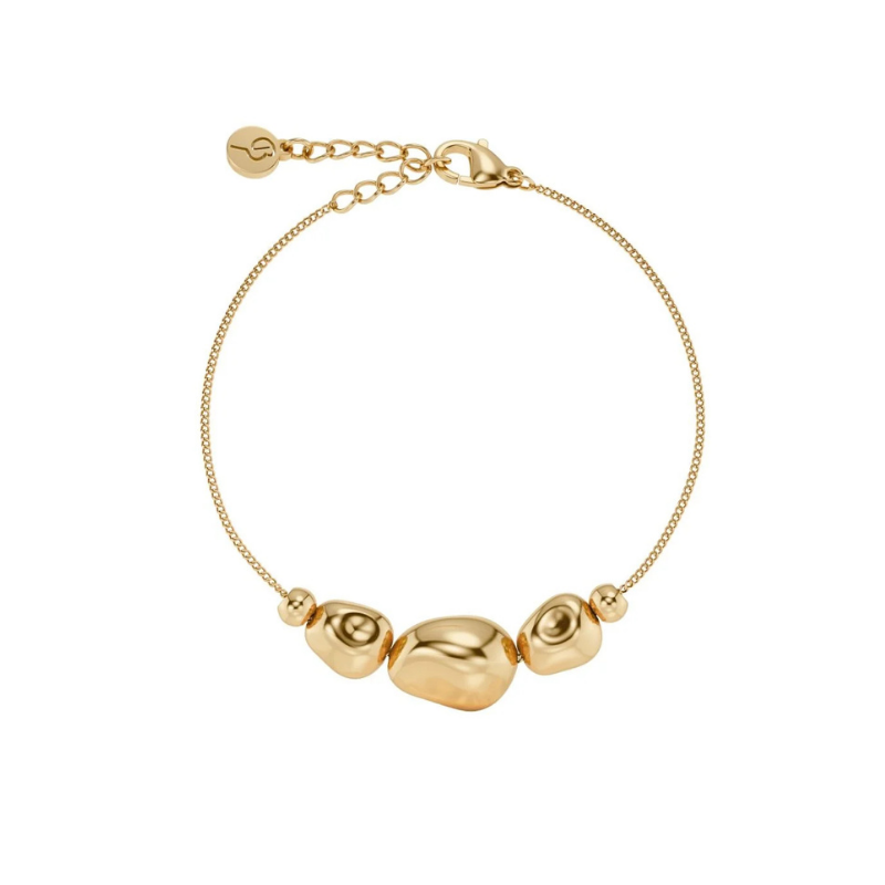 Leora-serien er inspireret af sten på en strand, der er slebet glat af havets endeløse rytme. Den blander organiske former med en stilfuld, underspillet elegance. Her ses Leora-seriens smukke armbånd i en 14K guldbelægning med tre små, uregelmæssigt formede sten på en facetslebet panserkæde. Fin i kombination med seriens øreringe.