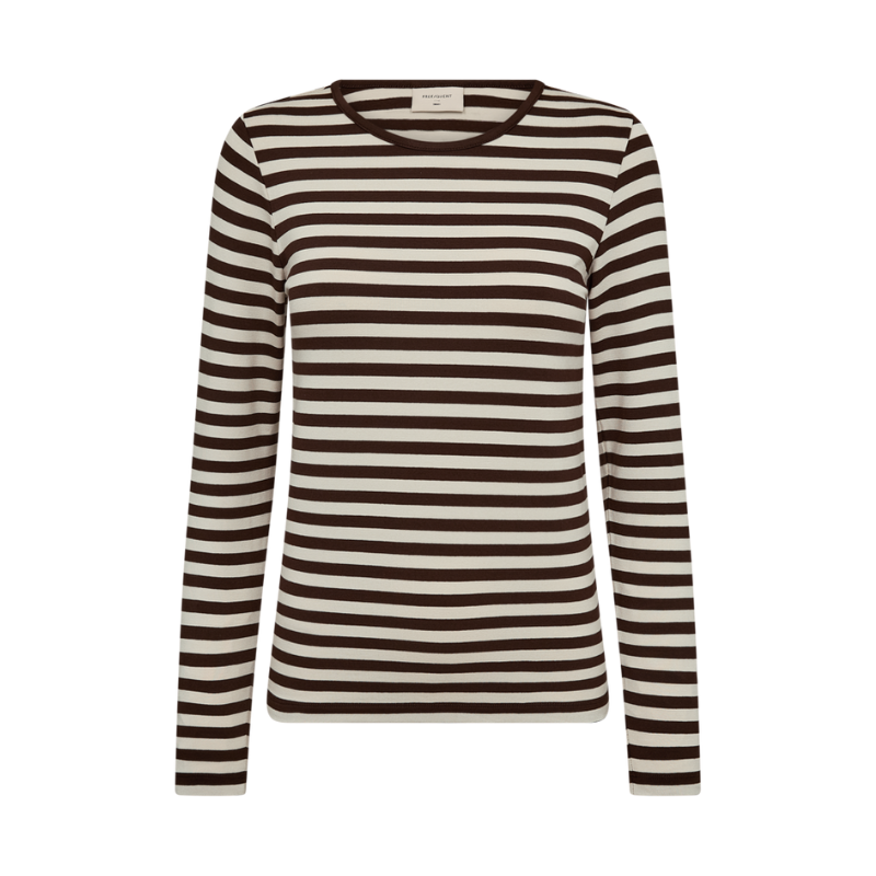 Liana langærmet t-shirt fra Freequent i en blød kvalitet med kontraststriber. Derudover er t-shirten enkel i modellen med rib i den runde halsudskæring samt en smal pasform.