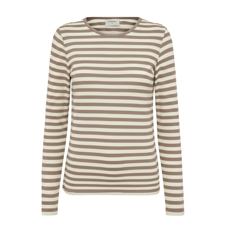Liana langærmet t-shirt fra Freequent i en blød kvalitet med kontraststriber. Derudover er t-shirten enkel i modellen med rib i den runde halsudskæring samt en smal pasform.