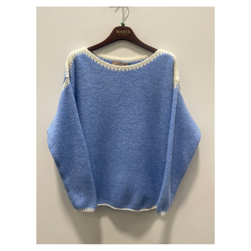 Linette strik fra Marta er en smuk blå strik med hvide kontrast syninger ved hals, skulder og bund.