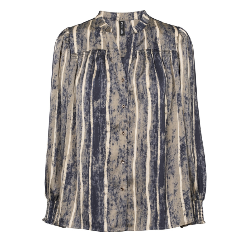Lissa bluse fra Prepair er en elegant bluse med et smukt, kunstnerisk mønster i blå og beige nuancer. Blusen har en lille opstående krave med V-udskæring og gennemgående knapper foran.