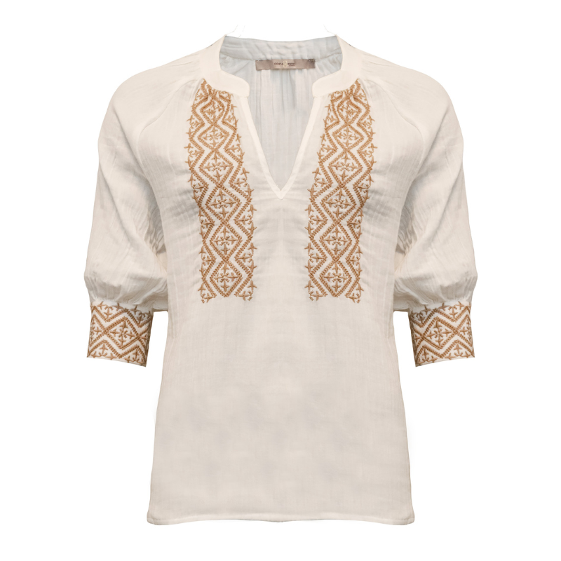 Louise bluse fra Costa Mani er en let og feminin bluse i naturfarvet bomuld med dekorative broderier foran og på ærmerne. Blusen har en afslappet pasform, trekvartærmer og en lille slids i siden-perfekt til både hverdag og sommerlige anledninger.