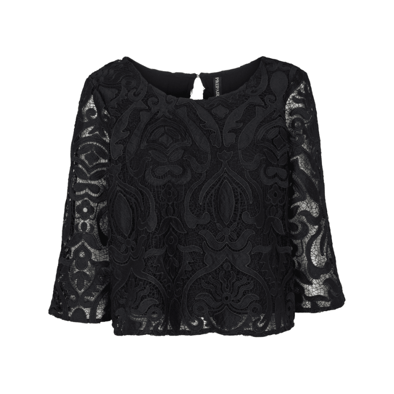 Madeleine bluse fra Prepair er en smuk og feminin blondebluse. Den har rund halsudskæring, løs pasform og 3/4-ærmer. Blusen er foret på kroppen for ekstra komfort, mens ærmerne er gennemsigtige og giver et elegant udtryk. Bagtil lukkes den med en lille knap i nakken. Fås også i hvid.