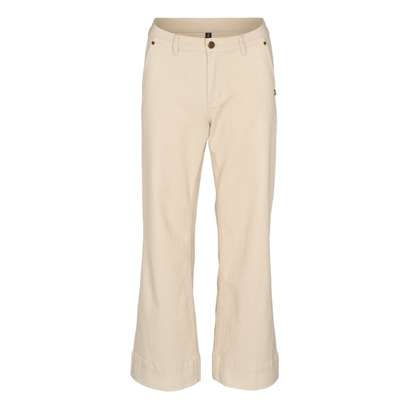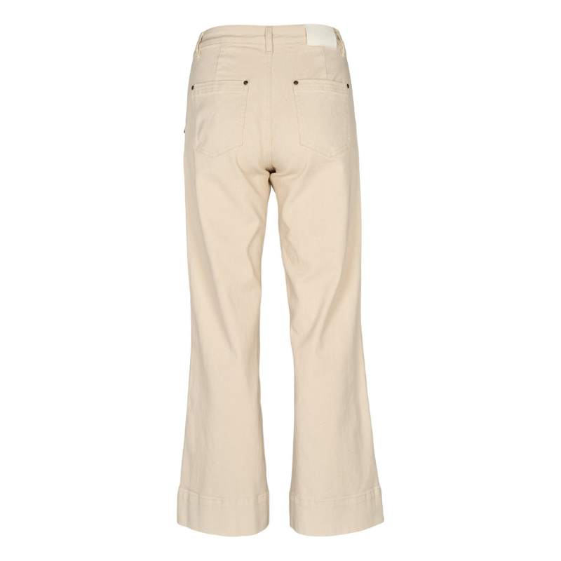 Malia Jeans fra Prepair er en super lækker jeans i en fin Off White farve med vidde. Bukserne har mellemhøj talje og fast linning med bæltestropper, to sidelommer samt to baglommer. Benene afsluttes med en bred, påsyet kant forneden, som giver et markant og struktureret udtryk. Bukserne er med lynlås og en enkelt knap og er i en blød og lækker kvalitet.