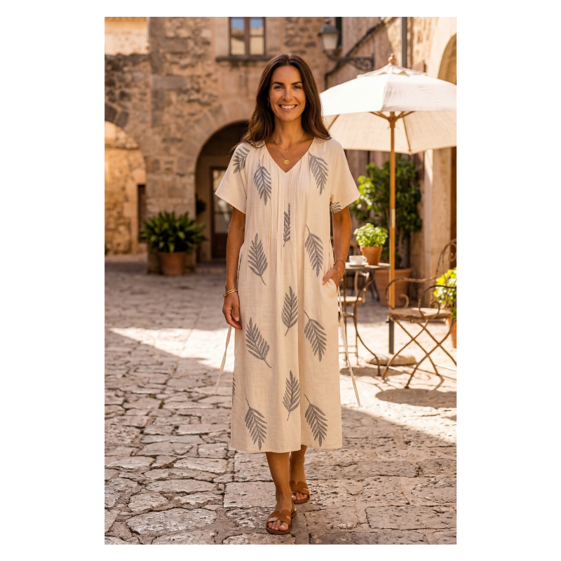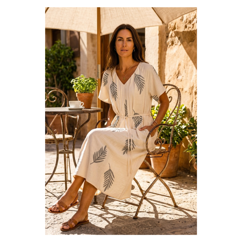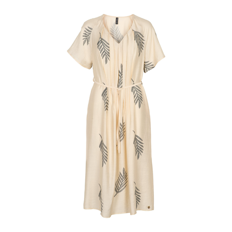 Maria kjole fra Prepair. En fin midi kjole i lys beige med gennemgående bladprint i kontrastfarve. Modellen har V-udskæring og korte ærmer og lommer i sidesømmen samt en løs og let pasform. Kjolen har et aftageligt bindebælte i taljen, som giver mulighed for at justere silhuetten.