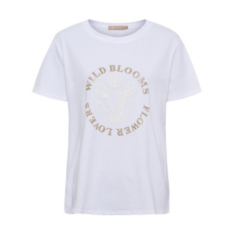 Blød T-shirt med fine, farverige blomsterdetaljer og tekst. Den afslappede pasform giver et feminint og legende udtryk – perfekt til hverdagsbrug.