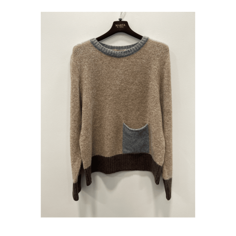 Mdc Elora strik fra Marta du Chateau i en lækker camel farve med mørkebrune kontraster og blå lomme.