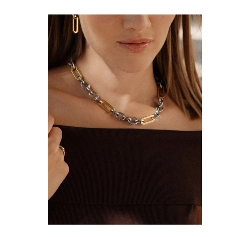 Den cool Medley-serie kombinerer chunkytrenden med en blanding af rustfrit og forgyldt stål for at skabe en serie, der virkelig skiller sig ud. Her ses Medley-seriens flotte halskæde, der veksler mellem større led i forgyldt stål og mindre led i blankt rustfrit stål. Ekstra effektfuld sammen med seriens øreringe, armbånd eller ring.
