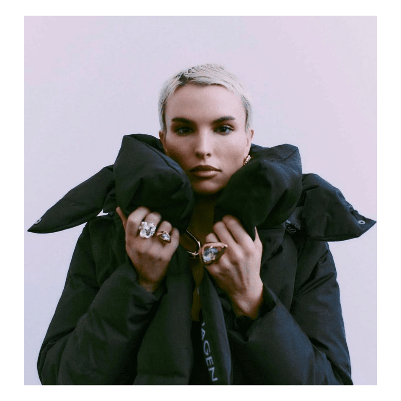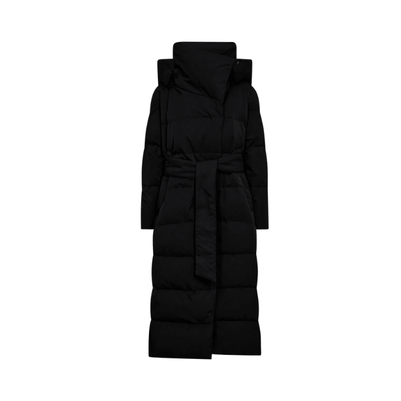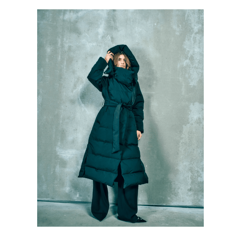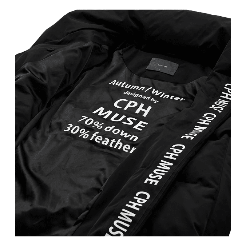 MICCO-HAT-COAT fra Copenhagen Muse er en lang dunfrakke i en eksklusiv kvalitet med trykknapslukning, sidelommer samt logodetaljer på den aftagelige hætte, det brede bindebåndet i taljen og på foret.