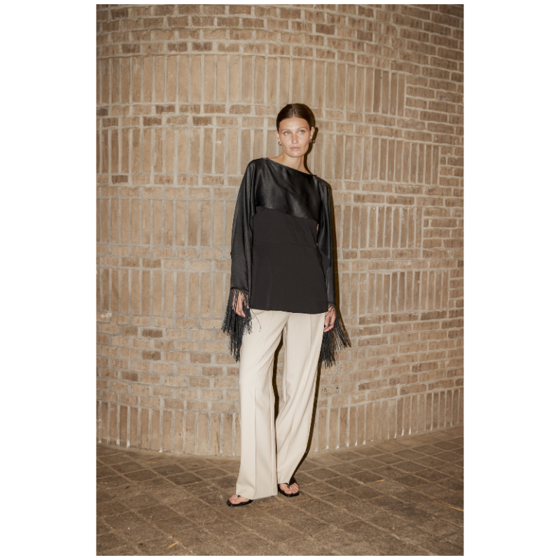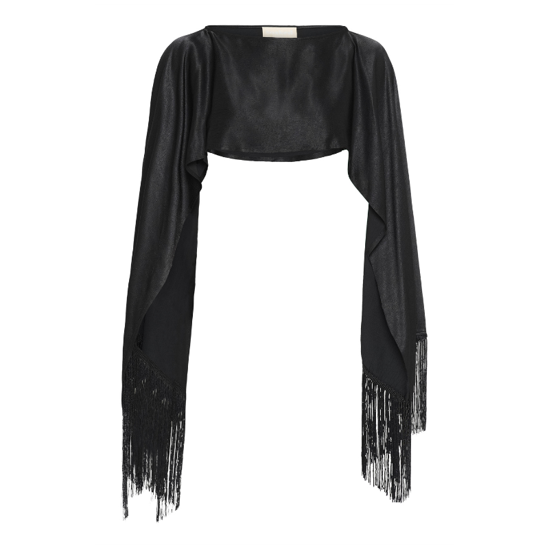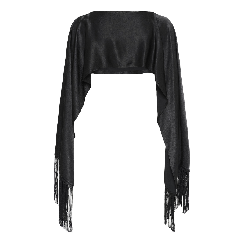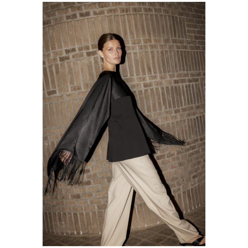 Tørklædet er med rund hals og lange ærmer med flot frynsekant.
