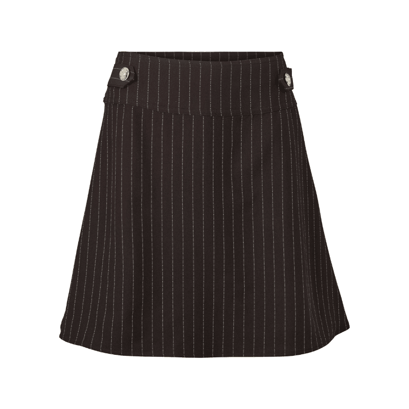 Olivia nederdelen fra Prepair i fin nålestrib er kort og A-formet, har en simpel silhuet, løs pasform og falder lige over knæene. Nederdelen har en bred fast linning med lynlås samt to pynte stropper med knap på hver hofte.