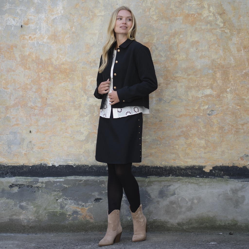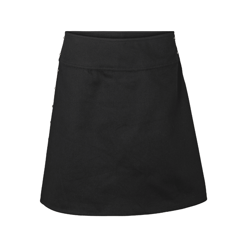 Olivia nederdelen fra Prepair i sort med nitter ned langs siden. Modellen er kort og A-formet, har en simpel silhuet, løs pasform og falder lige over knæene. Nederdelen har en bred fast linning med lynlås.