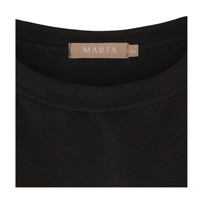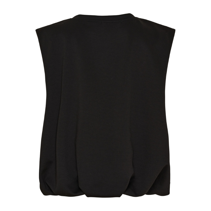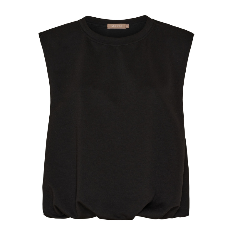 Orla vest fra Marta er en simpel sort vest. Vesten har en rund hals og brede skuldre. Den har et løst snit med elastisk forneden, som giver en flatterende pasform. Style alene eller over en skjorte for et fint lag på lag look.