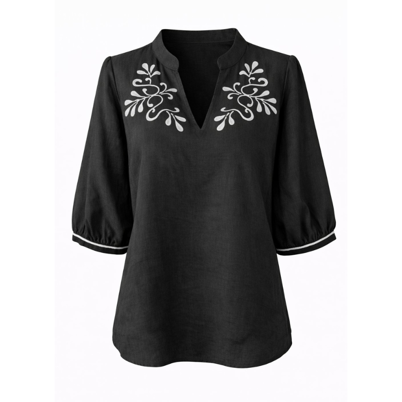 Blusen har v-hals, 3/4 lange ærmer og et flot broderet mønster ved hals. Perfekt til både hverdag og festlige anledninger. Fås også i brun.